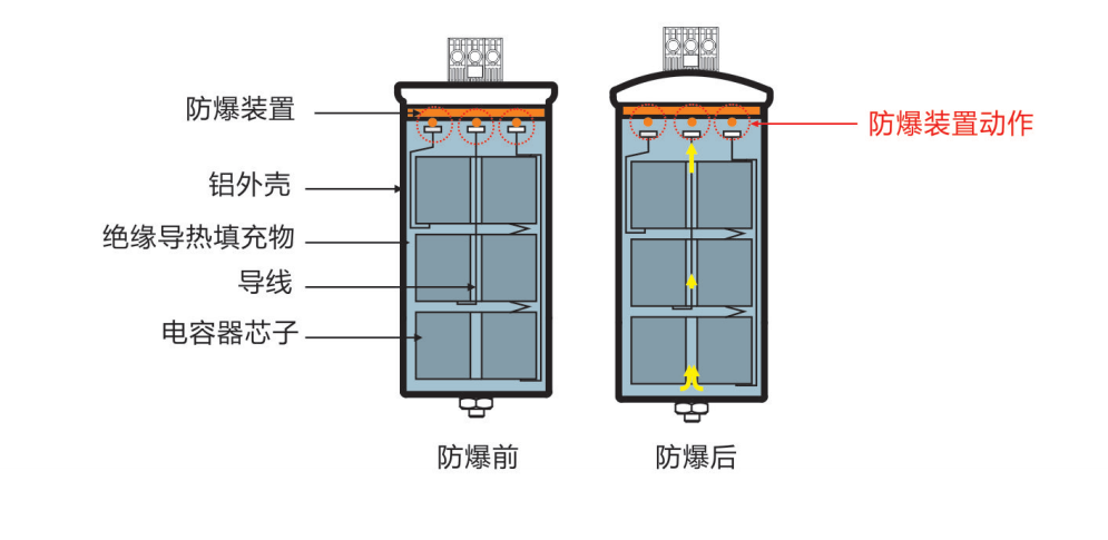 ● 防爆裝置;當(dāng)電容器內(nèi)部發(fā)生故障,溫度持續(xù)升高導(dǎo)致聚丙烯膜自愈能力下降或者損壞,產(chǎn)生氣體壓力,過壓保護裝置會在壓力作用下變形升高,進行防爆泄壓。