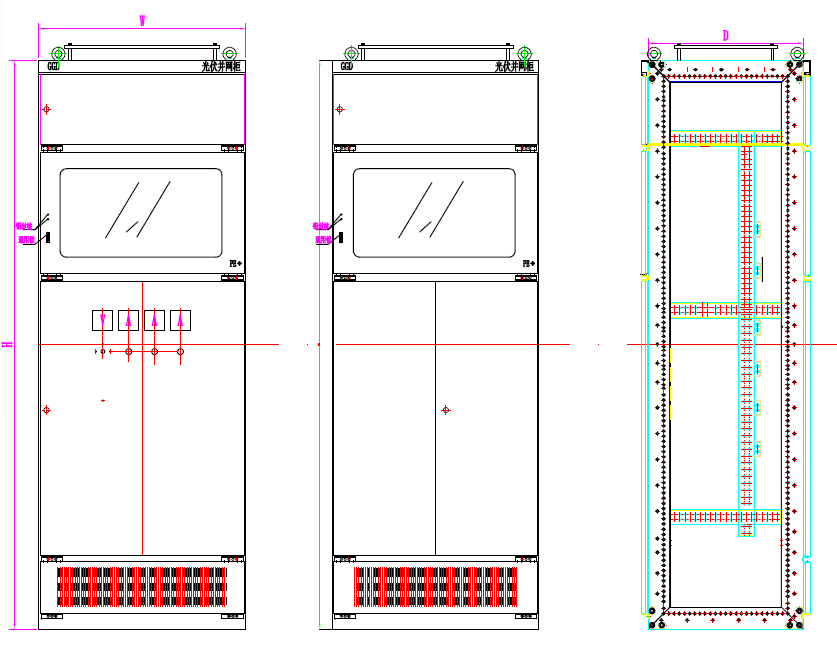 GGD(GF)系列光伏并網(wǎng)柜作為光伏電站的總出口存在于光伏系統(tǒng)中,是連接光伏電站和電網(wǎng)的配電裝置,其主要作用是作為光伏發(fā)電系統(tǒng)與電網(wǎng)的分界點。對于低壓并網(wǎng)的光伏電站,光伏并網(wǎng)柜中還可以加裝計量、保護等功能器件。主要由防孤島保護裝置,并網(wǎng)開關(guān)、防雷器、溫濕度控制器、電能計量裝置和柜體附件等相關(guān)硬件組成。光伏并網(wǎng)柜主要用于110KV、35KV的集中式光伏并網(wǎng)接入系統(tǒng)和10KV、380V分布式光伏接入并網(wǎng)系統(tǒng)。