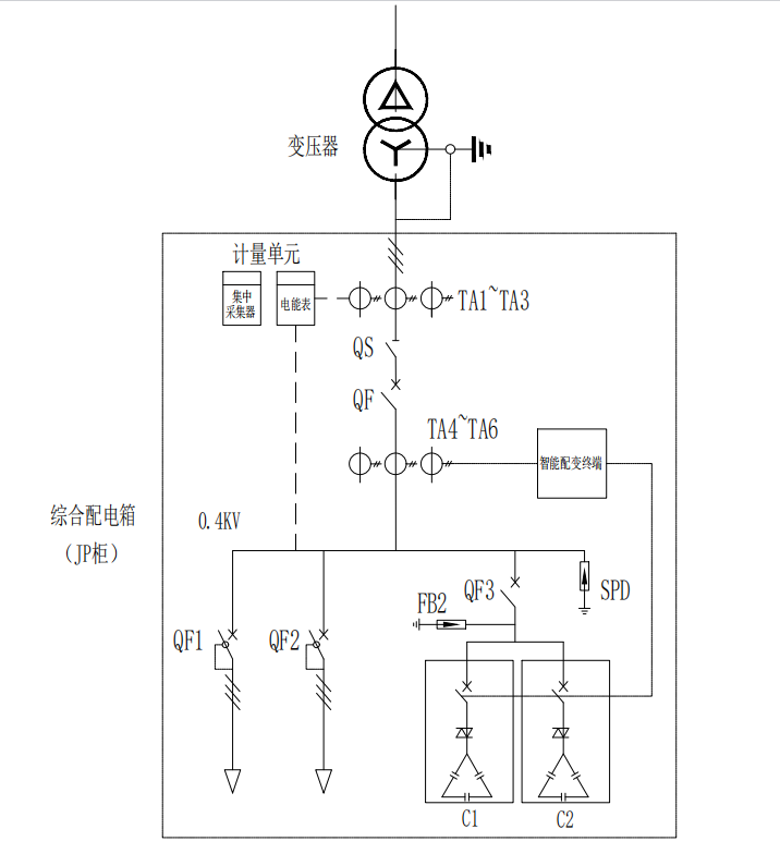 PXTF(JP)系列智能綜合配電箱適用于0.4KV系統(tǒng),城鄉(xiāng)電桿上公用配電變壓器低壓側(cè)安裝使用,簡(jiǎn)稱“JP柜”,根據(jù)配置功能不同,主要由公變采集終端、開關(guān)設(shè)備、無功補(bǔ)償裝置、剩余電流保護(hù)器、防雷裝置、外殼及導(dǎo)體等核心部分組成,集合了配變監(jiān)測(cè)、電能計(jì)量、電能分配及無功補(bǔ)償?shù)裙δ苡谝惑w,起到變壓器剩余電流保護(hù)、遠(yuǎn)程控制、低壓集抄等多種功能作用,產(chǎn)品穩(wěn)定高效,廣泛應(yīng)用于農(nóng)網(wǎng)系統(tǒng)當(dāng)中。