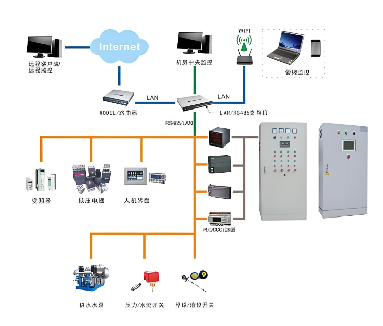 供水設(shè)備是為解決由于壓力不足,無(wú)法到達(dá)用戶(hù)用水的高度或流量,而專(zhuān)門(mén)研發(fā)設(shè)計(jì)的新型環(huán)保節(jié)能的專(zhuān)業(yè)設(shè)備。供水設(shè)備可分以下幾種,水箱供水設(shè)備,無(wú)塔供水設(shè)備,消防供水設(shè)備,變頻恒壓供水設(shè)備,通過(guò)該系統(tǒng)可實(shí)現(xiàn)對(duì)水泵的開(kāi)停、主排水管路的流量、水泵排水管的壓力、水倉(cāng)的水位等信號(hào)的實(shí)時(shí)監(jiān)測(cè),并能通過(guò)該系統(tǒng)實(shí)現(xiàn)三臺(tái)主水泵的自動(dòng)、手動(dòng)控制并和PLC監(jiān)控系統(tǒng)的聯(lián)網(wǎng)運(yùn)營(yíng),實(shí)現(xiàn)地面監(jiān)控。